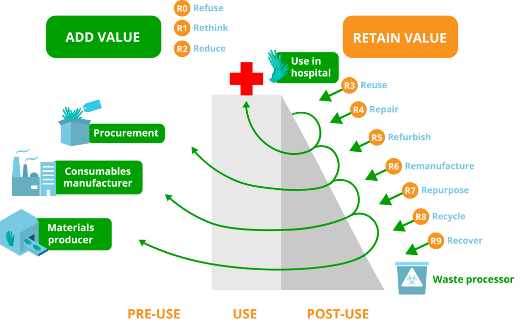 “Circularity is the systematic organisation of resource use avoidance and/or value retention in loops of products, components, and raw or processed materials, with the aim of extending their lifetime and minimising the need for new (virgin) non-renewable resources and the creation of negative impacts across the entire lifecycle while maintaining or improving value in healthcare.”